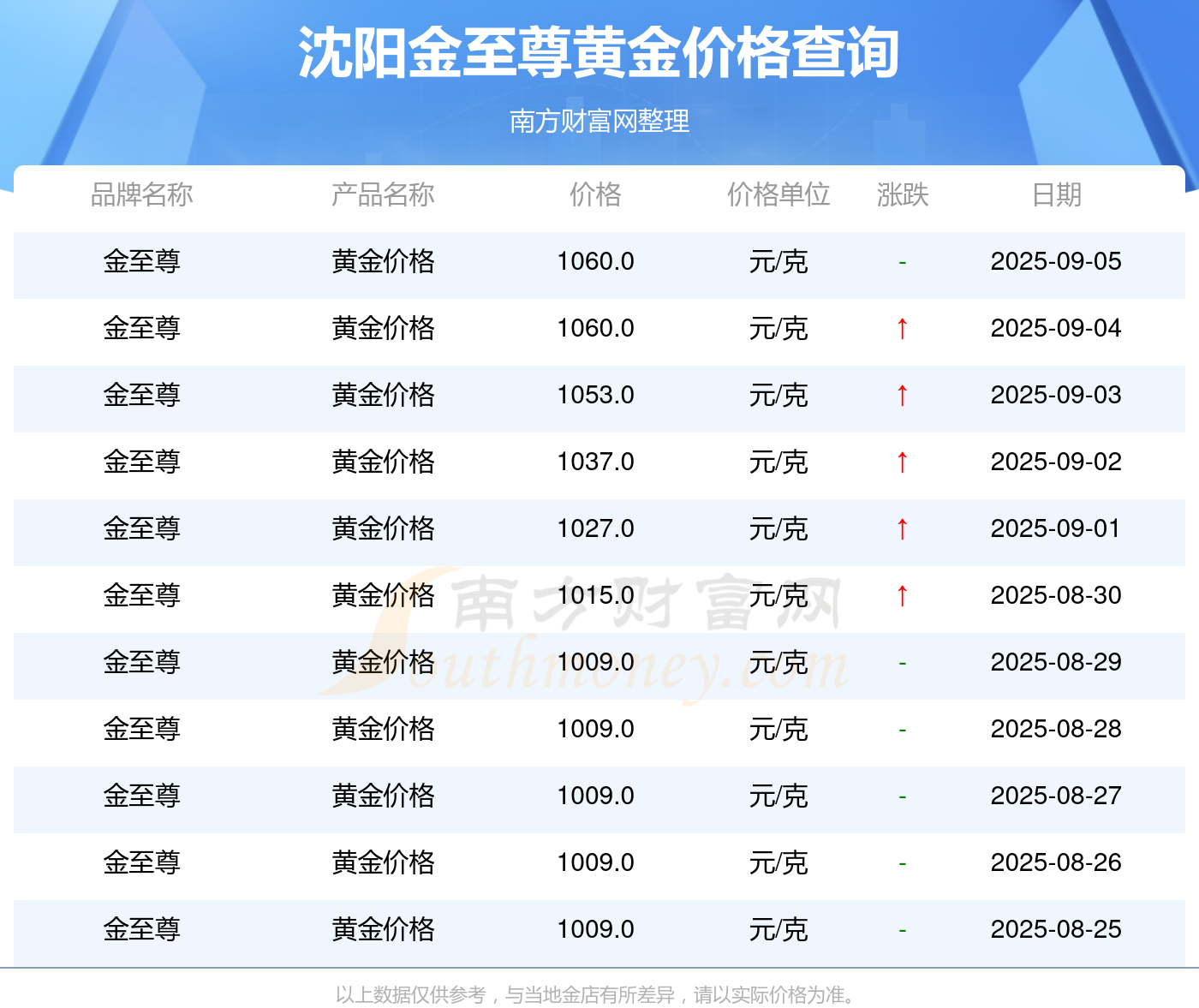 2025年9月6日当天,沈阳金至尊黄金价格的单价是 1060.0元/克。
